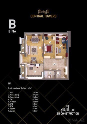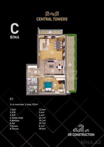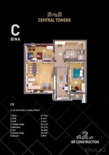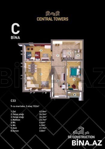 Kompleksdə dəniz, park və şəhər panoramalı mənzillər mövcuddur. Mənzillərin daha gözəl, geniş və işıqlı olması üçün "Central Towers"da sakinlərə özəl mərtəbə hündürlüyü 3,6 metr, mənzillərin daxili hündürlüyü 3,44 metr olaraq layihələndirilib. Central Towers-ın tikintisində yüksək keyfiyyətli Avropa istehsalı korçərçivəli vitraj pəncərə, M350 markalı beton və Rusiya istehsalı armaturdan istifadə olunacaq. Həmçinin binanın hər blokunda 2 ədəd Avropa istehsalı olan sürətli və səssiz liftlər quraşdırılacaq. Mənzillərin yayda sərin, qışda isti olması üçün binanın fasadında xüsusi daş yun örtüyü, keramoqranit və boya istifadəsi nəzərdə tutulub. Mənzillərin 1 kvadrat metrinin nağd qiyməti 2440 AZN-dən başlayır. Qiymətlər mərtəbə və mənzərəyə görə dəyişir. Bütün istəklərinizin kompleksi bir ünvanda!